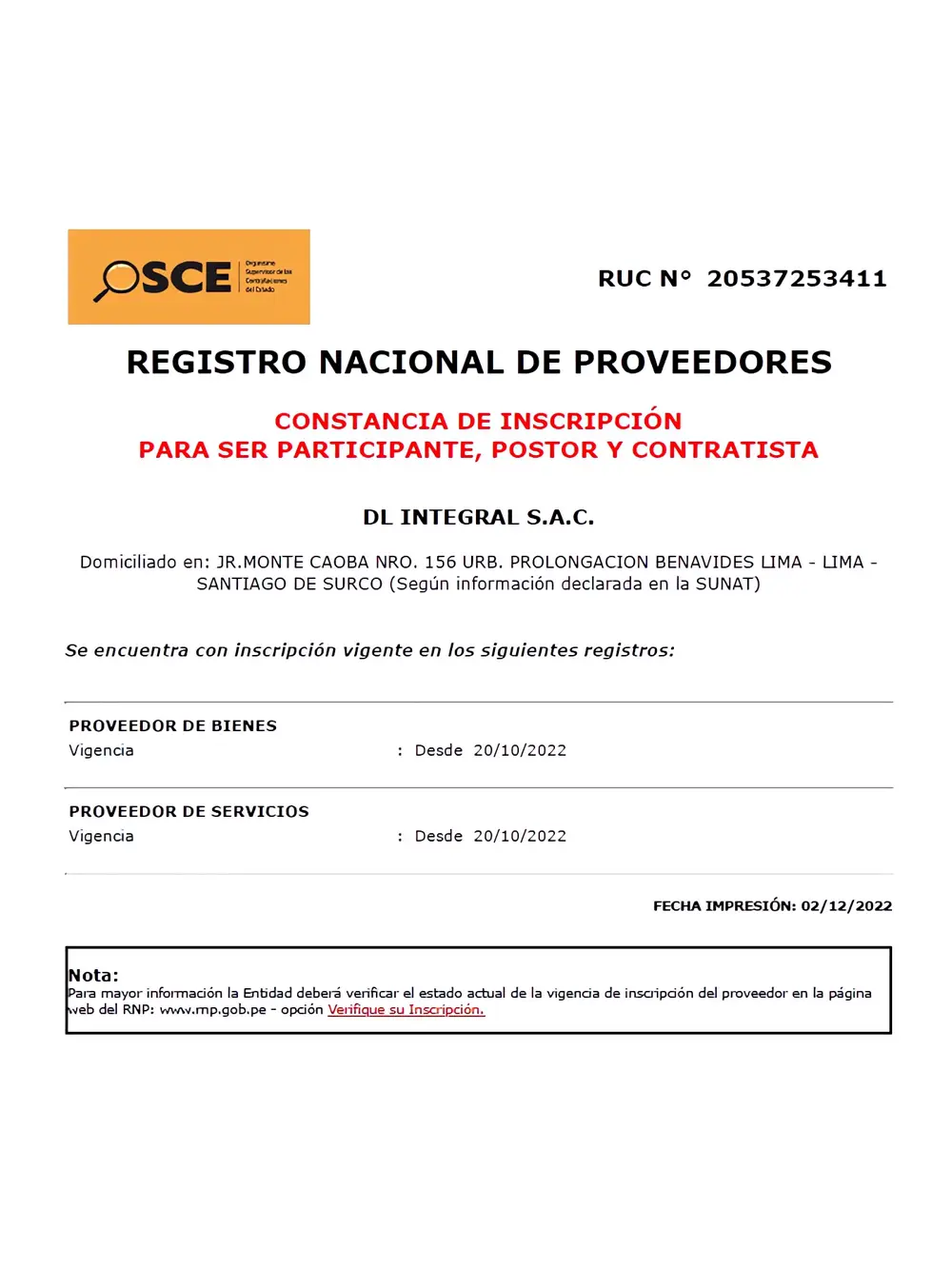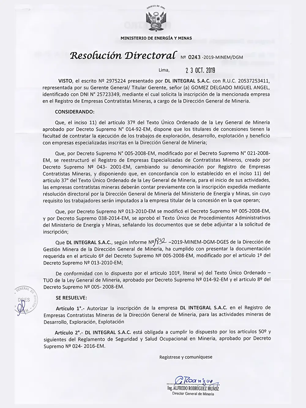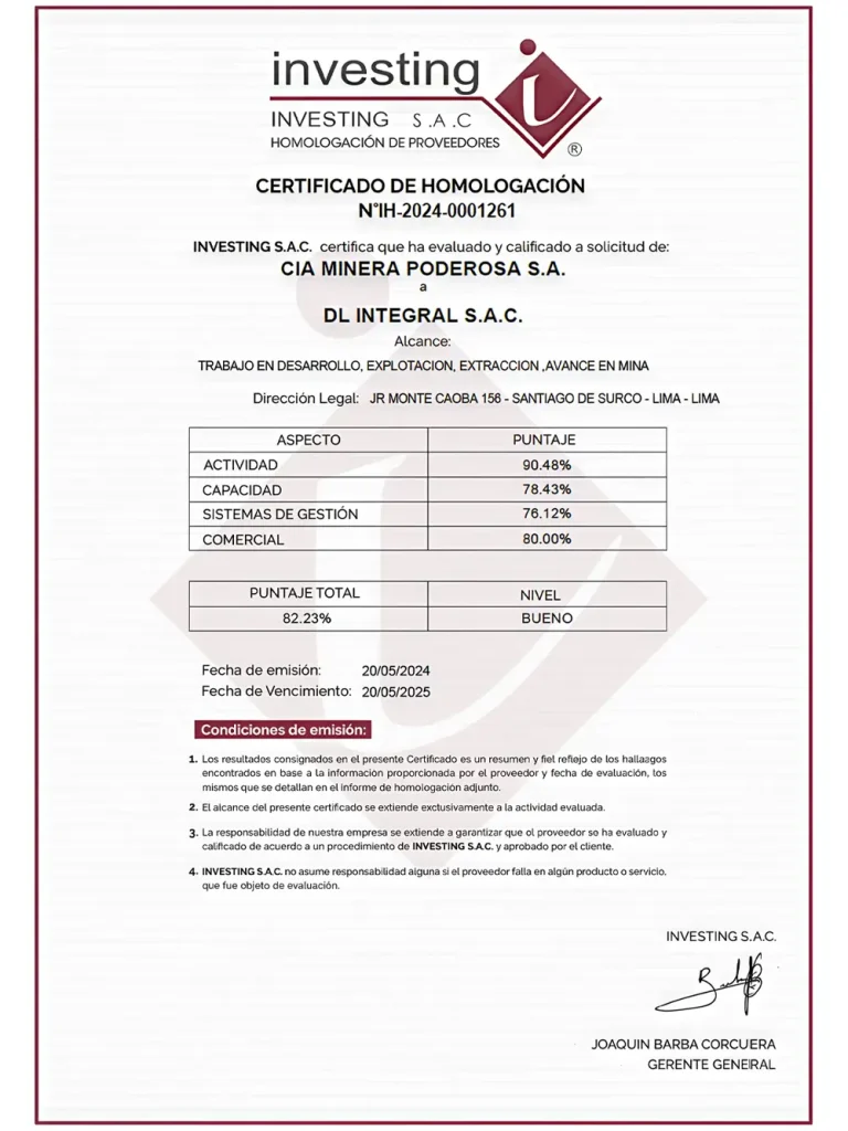 Contamos con certificaciones oficiales de la OSCE, el Ministerio de Energía y Minas y homologación de Investing S.A.C., garantizando nuestra capacidad y cumplimiento legal para el sector minero.